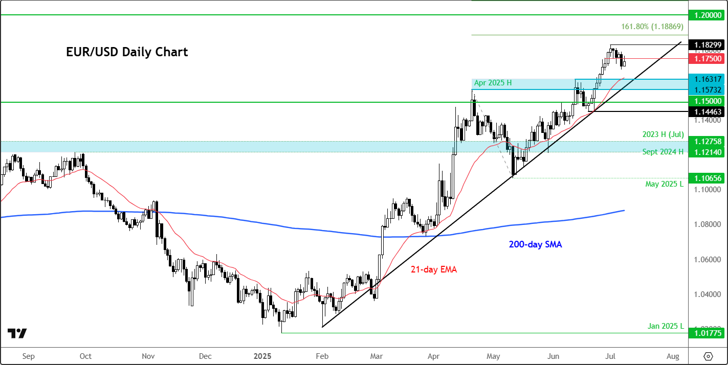 Markets have taken the latest tariff threats from Trump in their stride. Equity indices were quick to recoup most of their losses, with US futures trading higher and the DAX hitting a new weekly high today, reaching its highest levels since early June. In FX, the dollar has turned mixed, rising against the European major currencies, while weakening versus commodity dollars following that surprise RBA rate hold overnight and the firmer risk tone. Meanwhile, gold has fallen out of favour in preference to racier equity and crypto markets, with firmer bond prices and dollar also applying pressure. Investors presumably expect more deals to be done before the extended August 1 deadline. After all, Trump himself has said that he’s open to negotiations and that the August 1 deadline for implementation of new levies was “not 100% firm”. The EUR/USD forecast has not turned outright bearish yet, but some signs of technical weakness are now starting to emerge.