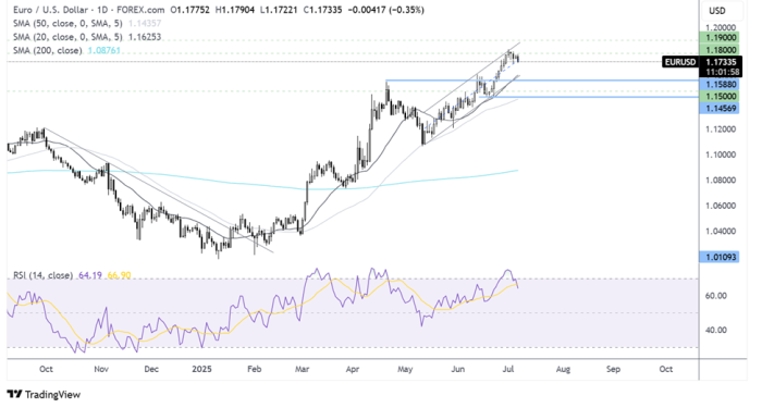 The EUR/USD trades within a rising channel that dates back to mid-May. The price encountered resistance at 1.1830, a 4-year high, and has since eased back below 1.1730, the midpoint of the rising trendline. The RSI has moved out of overbought territory.
