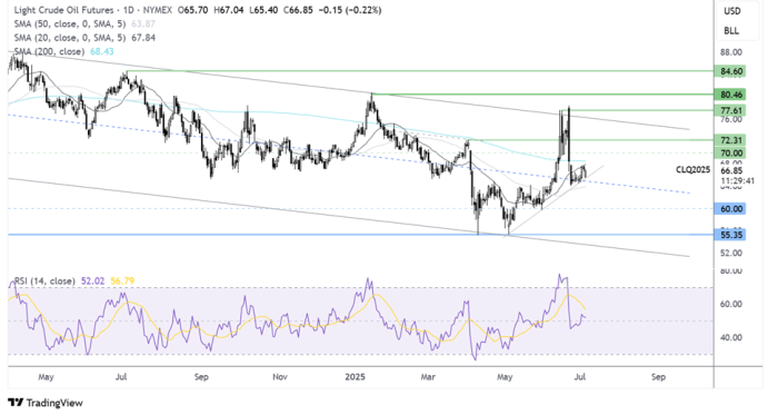 Following the recent volatility, which saw the oil price rally from a low of 57.00 to a high of 78 before falling to 64.00, the price is now trading more calmly. The price is trading in the long-term down channel. However, the price remains above the near-term rising trendline, dating back to early May, with gains capped by the 20 SMA.