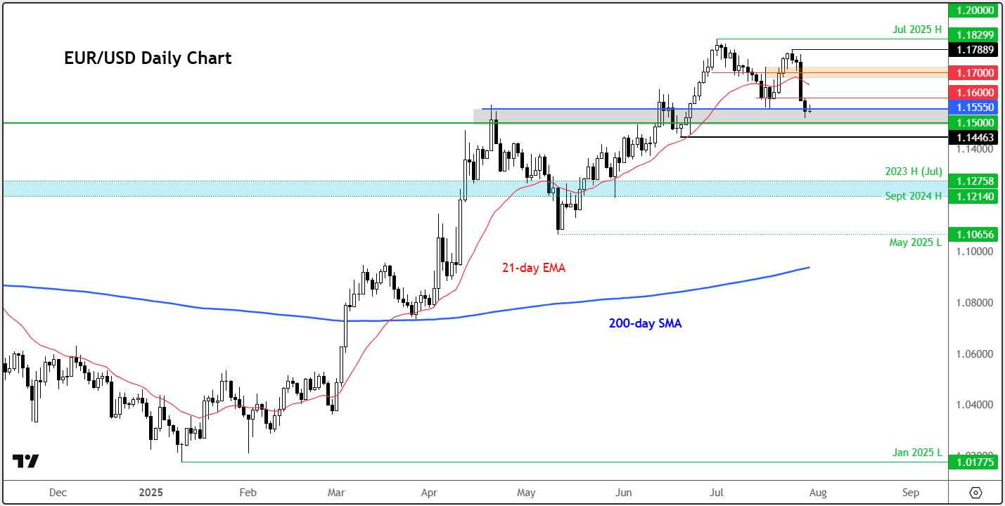 Meanwhile, oil markets could become a wildcard. President Trump’s move to accelerate the deadline for Russia to agree to a ceasefire has rekindled concerns over secondary sanctions. Should supply fears escalate, a spike in oil prices could weigh further on the euro while lending support to the dollar through the inflation channel.