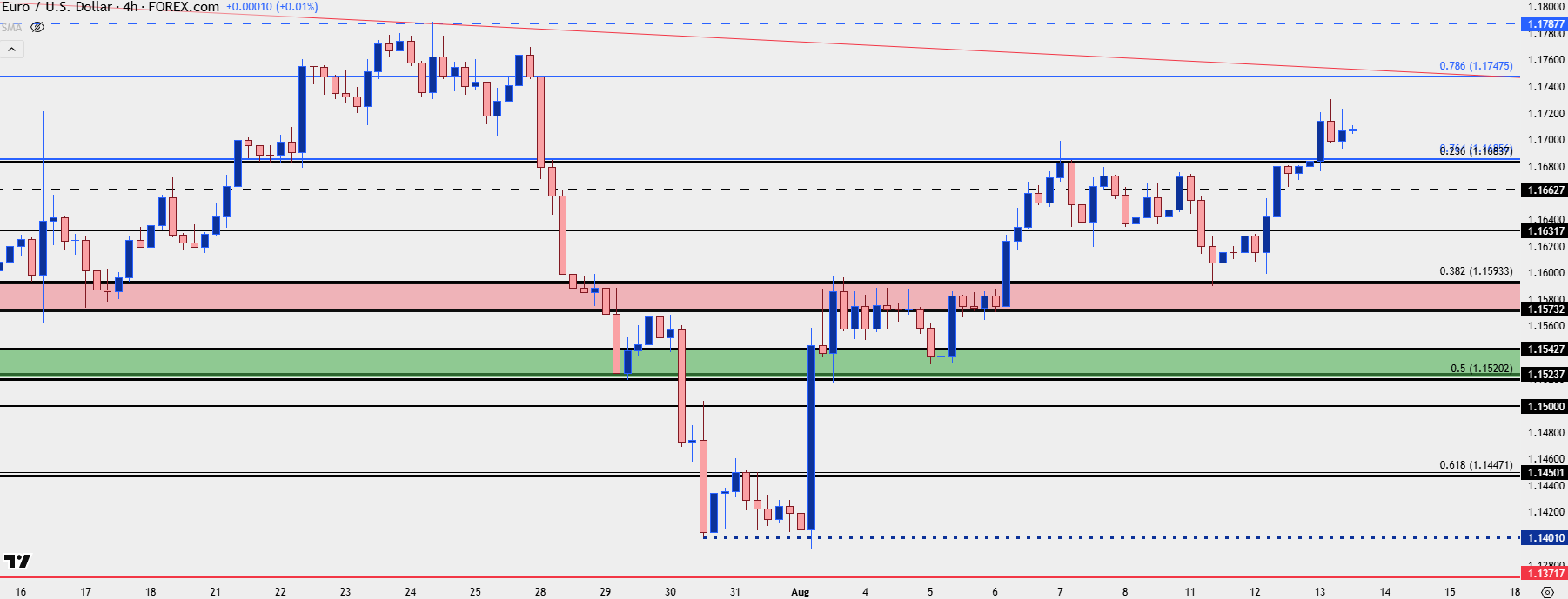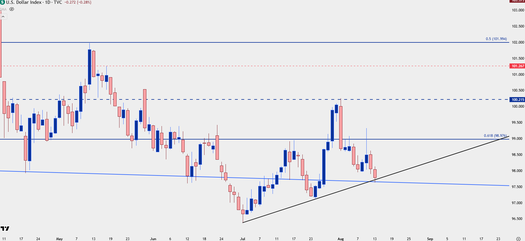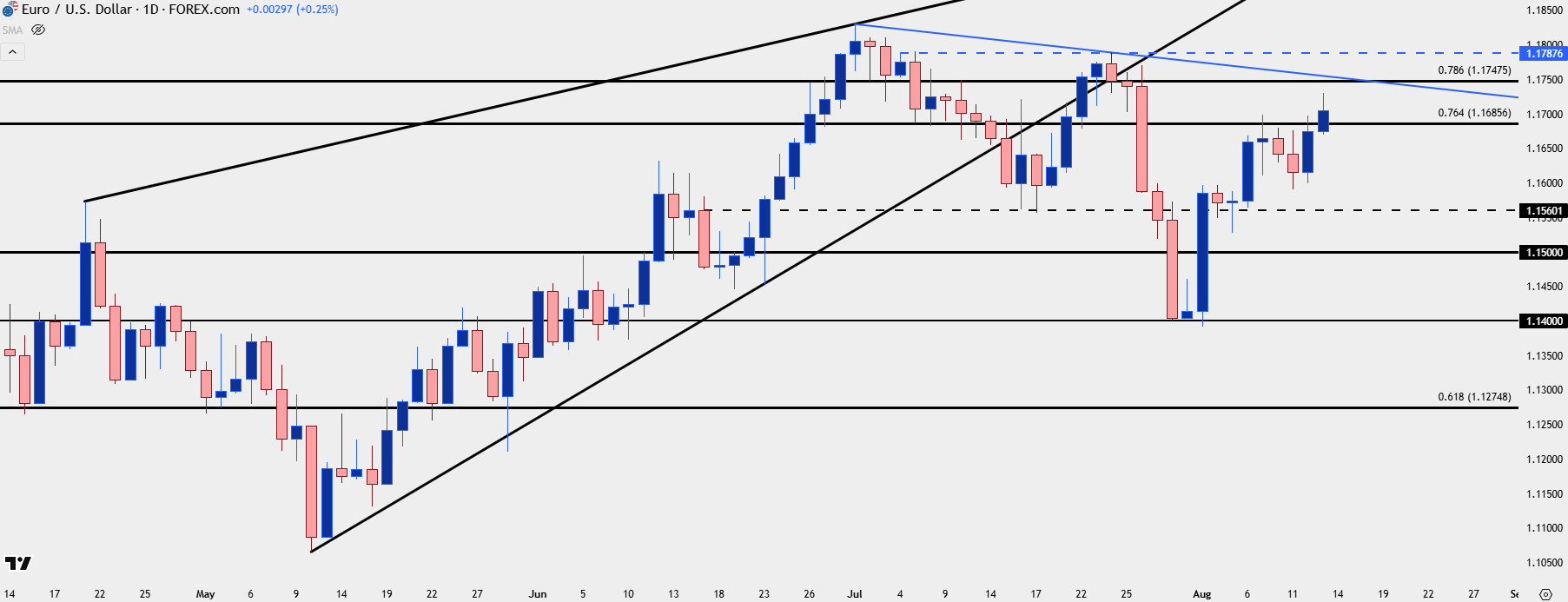 While that’s had some impact on the USD with a bearish series presenting so far in August, the bigger picture is less clear as the higher-low from July has, so far, remained in-play, and we’re even seeing a degree of support from the trendline produced by that higher-low. That’s drawn in black below, and there’s also a longer-term trendline shown in blue which presents an area of confluence on the chart.