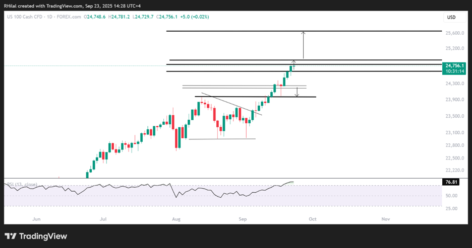 Looking at the Nasdaq chart from a daily time frame perspective, we can see that price action is trading above the 24,700-resistance zone. A hold above this zone may open the path toward 24,900–25,000, and potentially 25,700, in line with continued positive demand for technology and AI-related investments.