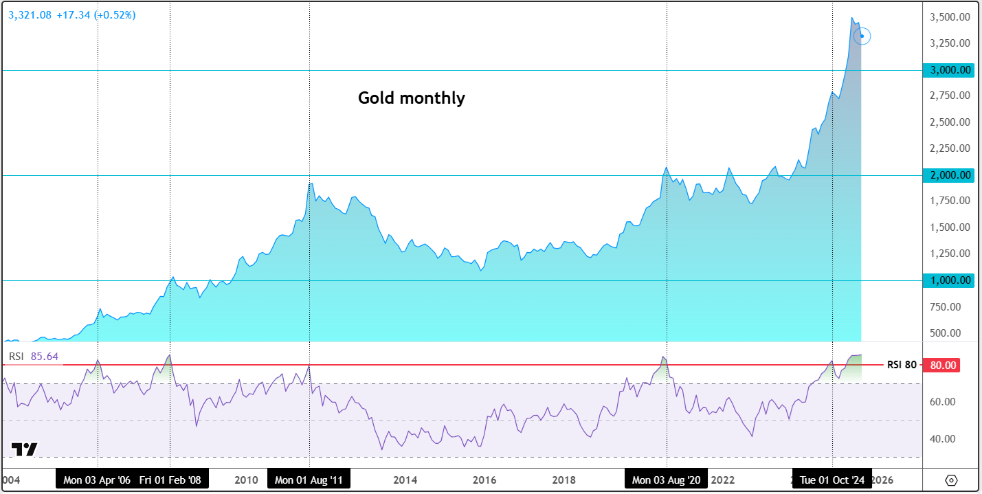 The monthly RSI has been above 70 since April 2024 and now stands above 85—levels not seen since the COVID-19 rally, after which gold consolidated for over three years before breaking out in March 2024. The last time RSI was this high before that was in 2011, just before a major peak. Historically, when the monthly RSI crosses 80, it has often signalled a correction or at least a pause in the rally—making this an important warning sign on the long-term chart.