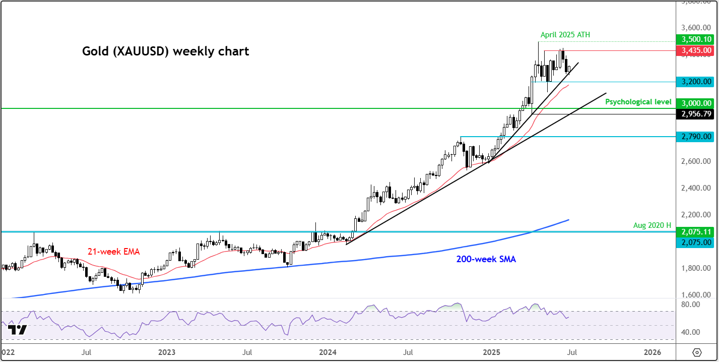 Given the strong uptrend, we favour looking for support around the faster 21-week EMA, which currently sits near $3170. Ahead of that, the 2025 trend line offers support around $3280–$3290.