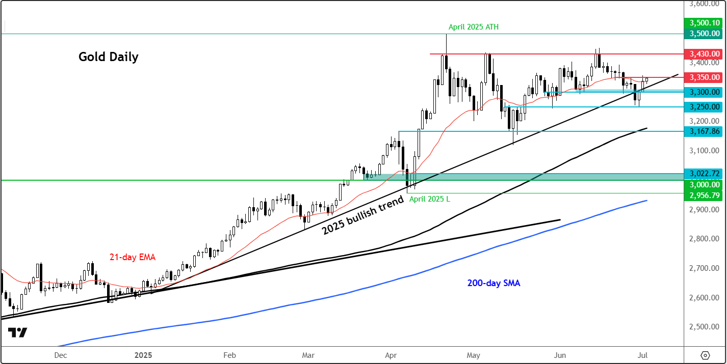 July 2, 2025 20:16Gold has been on the front-foot so far this week, with prices taking a boost by weakness in US dollar and a poor ADP report today. Still, the metal has been unable to hit new highs recently despite the renewed dollar selling in recent weeks, calling into question the validity of the bullish trend. Gold prices slipped 2.8% last week, following the breakdown below $3,300 support on Friday. This week, however, prices have bounced back to climb back above the 2025 bullish trend line and support at $3,300, following a brief breakdown. Still, bullish momentum has faded recently with the metal finishing off June essentially flat after closing unchanged in May, too. So, don’t expect a repeat of the first half of 2025 when it comes to gold forecast for the remainder of the year.