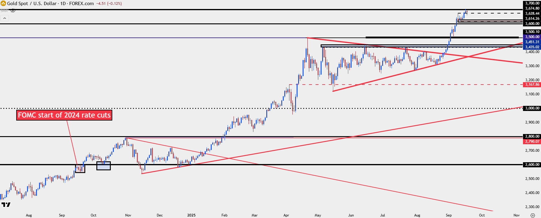 - Last year when the Fed started their rate cutting cycle, gold actually sold off on that day. The initial move was a press up for the first test of $2600, and that was followed by a brisk sell-off that ran into the end of the session. Gold recovered a day later and soon continued its bullish trend, but don’t underestimate the value of positioning for events like we have today and the move in gold has been very one-sided for the past month or so.