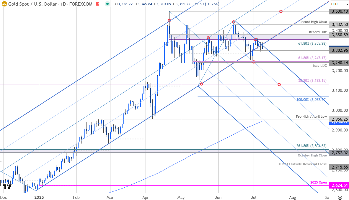 Bottom line: Gold is poised for a breakout of the weekly / monthly opening-range with the long-bias vulnerable while below the yearly high-day close. From a trading standpoint, rallies should be limited to 3380 IF price is heading lower on this stretch with a close below 3240 needed to suggest a larger reversal is underway. Be on the lookout for a potential exhaustion low closer to the lower parallels if the bears break through. Review my latest Gold Weekly Technical Forecast for a closer look at the longer-term XAU/USD trade levels.