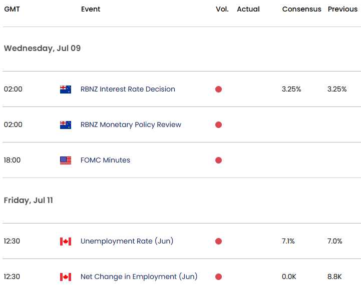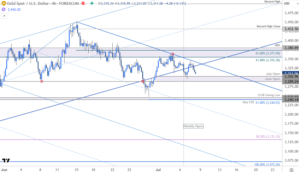 Notes: A closer look at gold price action shows XAU/USD trading within the confines of a descending pitchfork extending of the yearly highs with the weekly opening-range taking shape just below slope resistance. Initial support rests with the June / July opens at 3289-3303 and is backed by 3240/46- a region defined by the May low-day reversal close (LDC) and the 61.8% extension of the June decline, and the 5/28 swing low. A break / close below this threshold would be needed to invalidate the yearly uptrend / suggest a larger correction is underway toward 3132 and the 100% extension of the April decline at 3072– both levels of interest for possible downside exhaustion / price inflection IF reached.