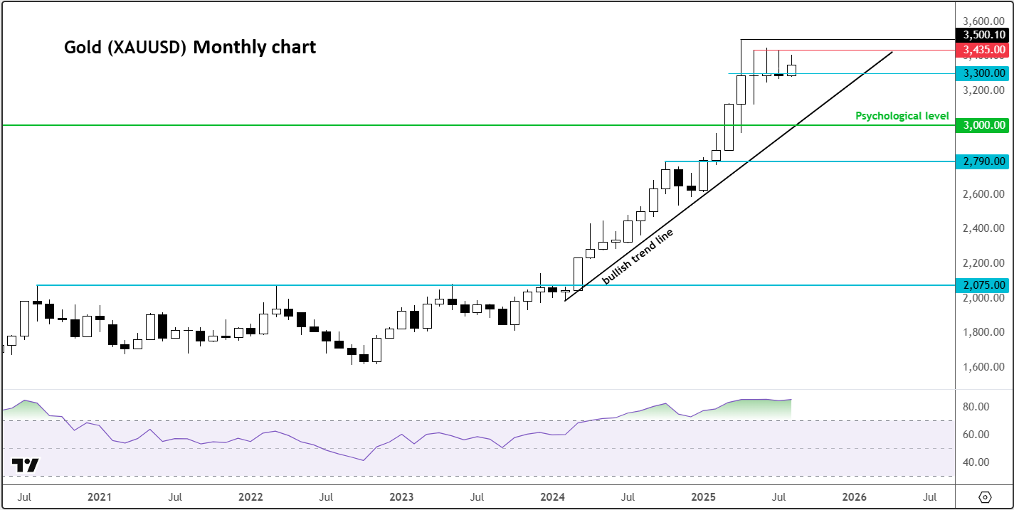In fact, the last three months have produced doji-style candles on the monthly gold chart, often associated with market tops. A decisive break and close below $3,300 would serve as a strong warning signal for traders.