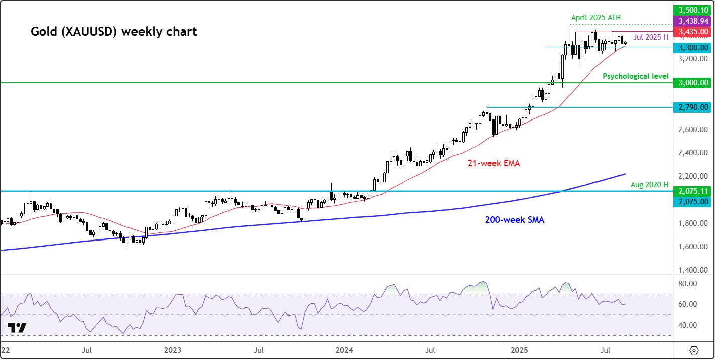 Gold kicked off the week on a steadier footing, recovering losses from Friday’s drop during Asian trade, before erasing those gains by later European trade. The metal slipped 1.8% last week, ending a two-week winning streak, yet prices are still hovering within familiar ranges. In truth, the past three months have seen gold drift sideways, unable to build momentum in either direction. Profit-taking has capped further gains, but ongoing central bank demand, a softer US dollar, and its safe-haven status amid trade disputes and the Ukraine conflict continue to underpin prices near record highs. With the short-term picture lacking clear direction, it may be wiser to step back and assess the longer-term gold technical analysis in trying to determine which direction prices are most likely headed.