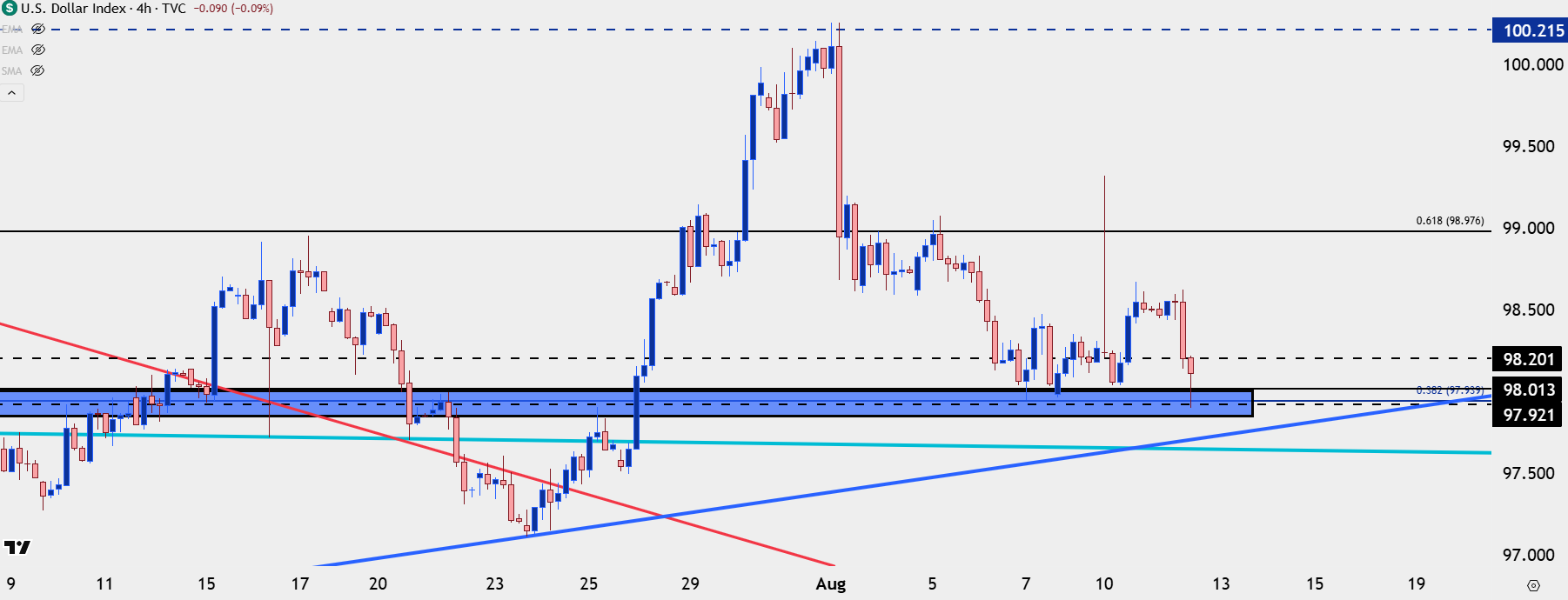 The response from markets has been clear as odds for a cut at the Fed’s next meeting in September have jumped up to 94.4%, as of this writing, and the USD has fallen in response. DXY is now re-testing the same 98.00 level that was in-play last week and that was the same level that was showing as support back in April for the US Dollar.