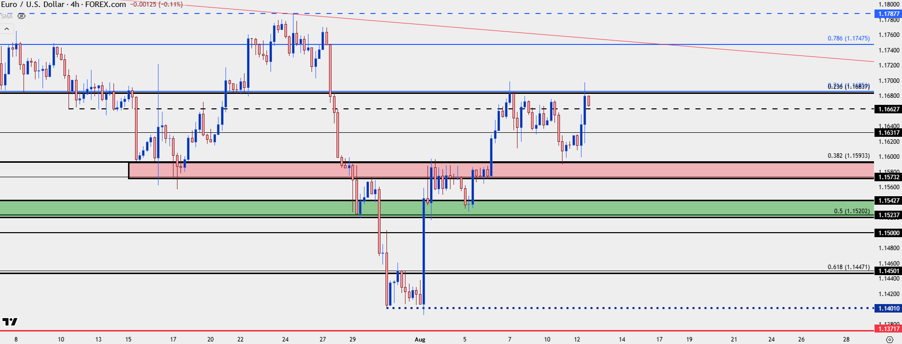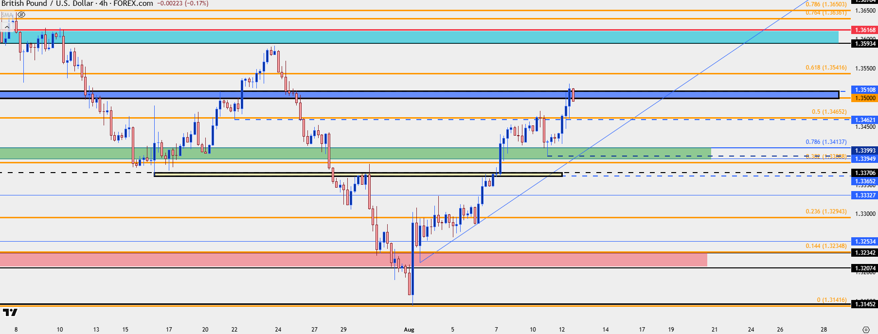 GBP/USD remains one of the more attractive venues for USD-weakness to continue. There was a strong reaction to the 1.3395-1.13414 zone last month around that Trump threat to fire Powell. As USD strength came back around the Fed and PCE report in late-July, GBP/USD perched all the way down for a re-test of the May low at 1.3145. Since then, however, bulls have been on the way back, pushing a rally even through last week’s BoE rate cut.