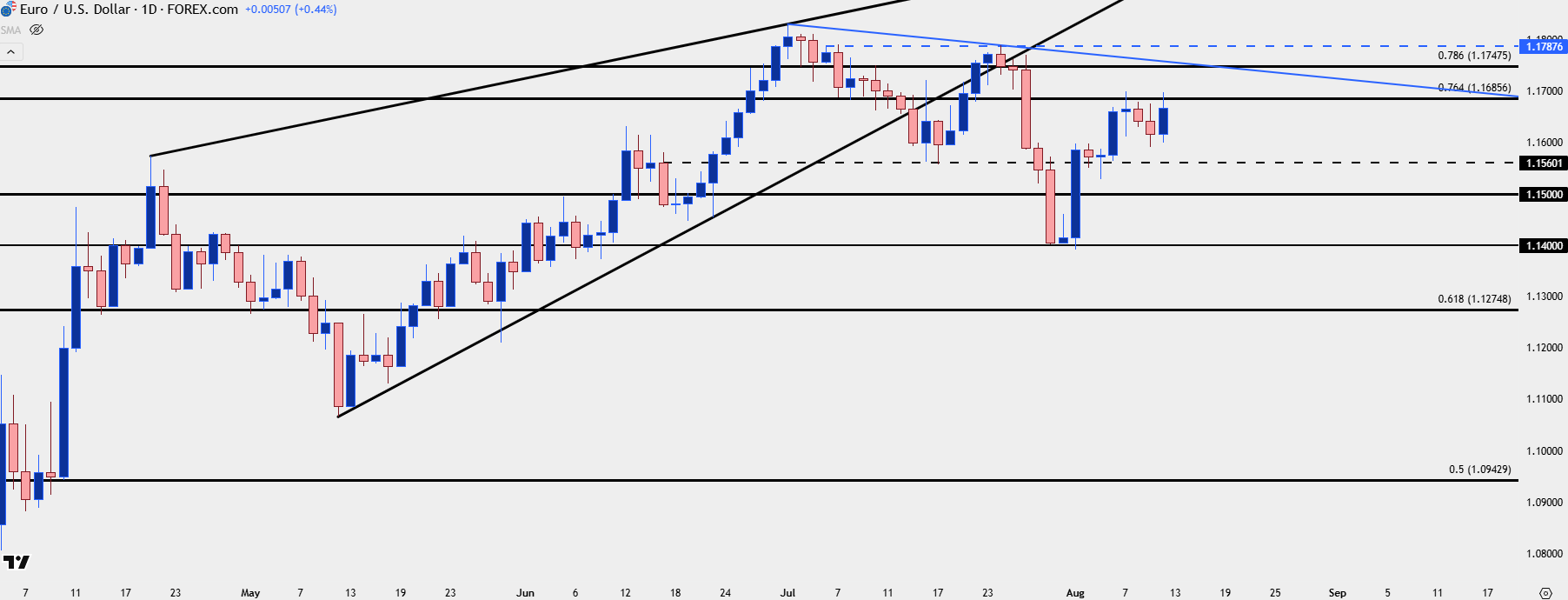 For the longer-term setup the big question here is that lower-low and high structure that’s built in the first half of Q3. Below we can see the prior swing high at 1.1788 and there’s a trendline projection that aligns with the 1.1750 area, around that deeper Fibonacci level later this week or early next week.