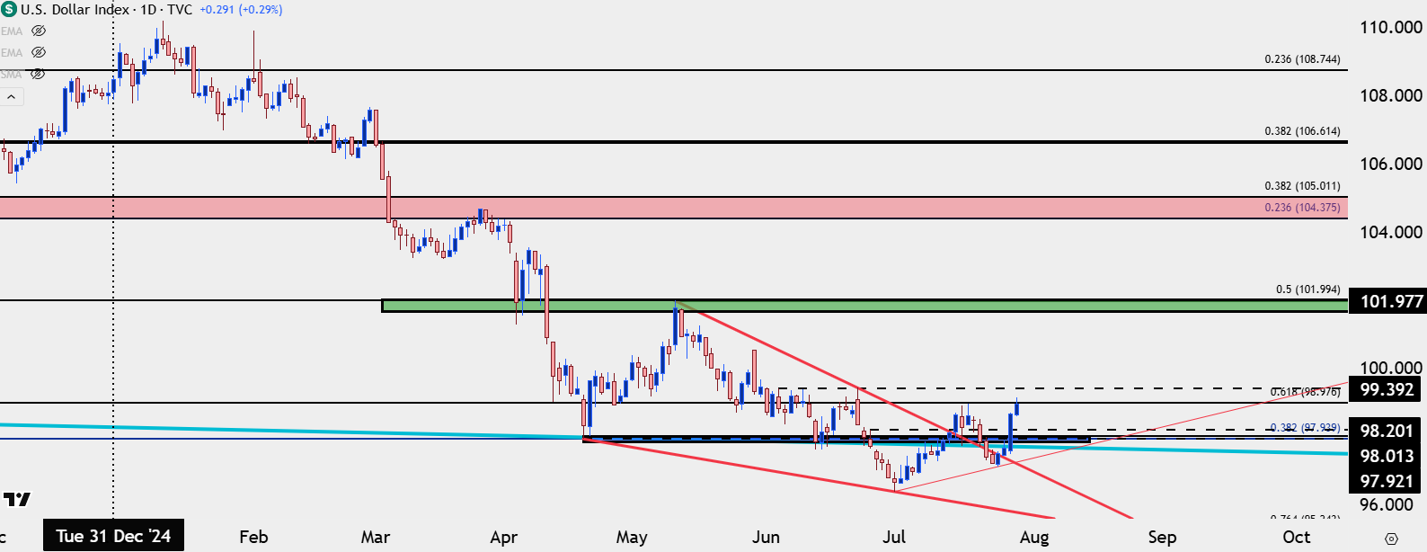 To date, most members of the Fed sound cautious around rate cuts, as last year’s softening led to a flare of inflation earlier in the year. There’s also the matter of tariffs to consider, with many Fed members expecting tariffs to hit supply which could then impact prices. At the last Fed meeting in June the USD broke out after, but it was the following Monday when one of the more dovish Fed members said that she would be open to a July rate cut and the USD weakness came rushing back. That allowed for a fresh three-year low on the first day of Q3, but since then, there’s been a shift. This morning’s higher-high couples with last week’s higher-low to illustrate bullish potential in the USD, and that puts a lot of emphasis on the calendar for the rest of this week.