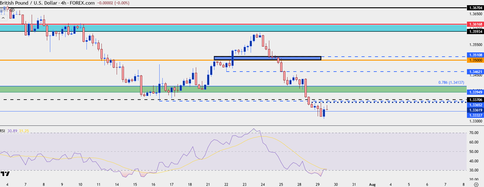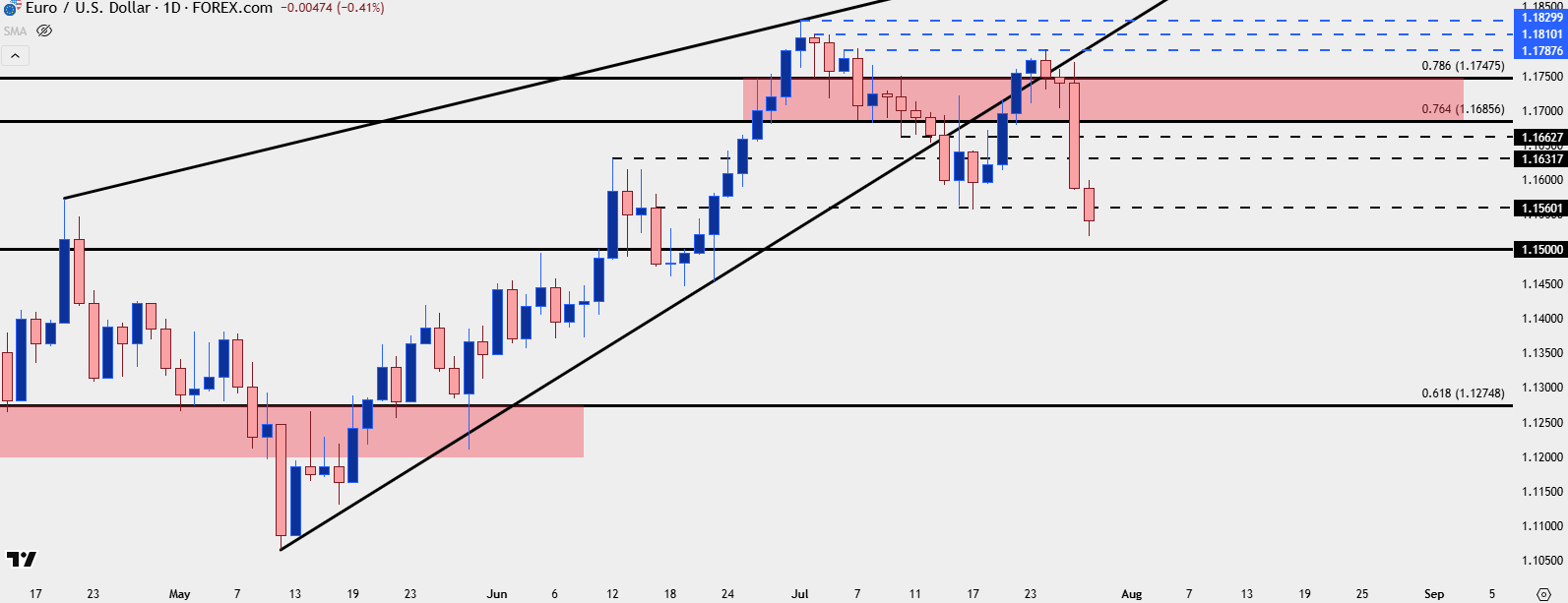 For next support the 1.1500 level is big, as this is a psychological level that can take some effort for bears to take-out, like how it took bulls a couple of different attempts over two months (late April to late June) before that resistance could finally play as support. This doesn’t eliminate bearish potential, but it does highlight that chasing the move at this point could be dangerous given the short-term oversold readings. Instead, this places emphasis on lower-high resistance potential at levels like 1.1560, which is already in-play, or 1.1632 or 1.1663, after which 1.1686 could even be of interest as this would be below last Friday’s high at the 78.6% Fibonacci retracement.