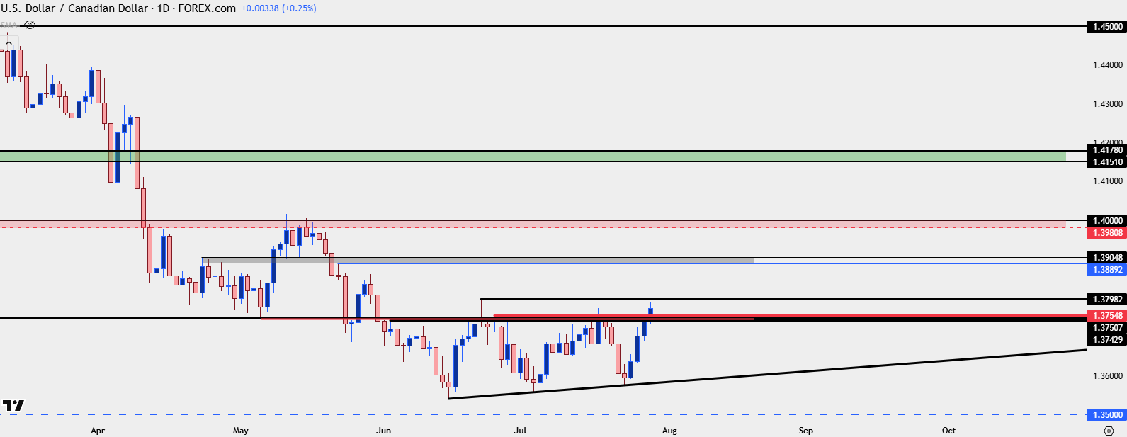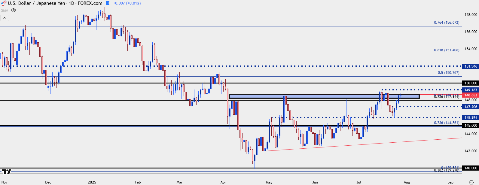 At this point there’s a massive spot of resistance sitting overhead and bulls have failed to test through it on multiple occasions. I looked into this in yesterday’s article and video, but the 148.00 zone has now held three different inflections going back to early-Q2 trade. But – each push has grinded a little bit higher, and the corresponding lows from each has also held at higher-lows.