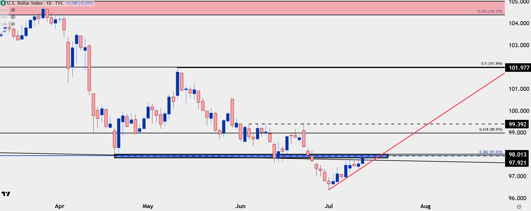 The U.S. Dollar has put together a strong week so far and that statement can be extended into the prior week, ever since the second day of Q3 trade. The currency dropped down for a fresh three-year low on the first day of Q3 and the second-half, but since then, bulls have put together a consistent streak of higher-highs and higher-lows albeit more reaction to support so far than resistance, over the past week.
