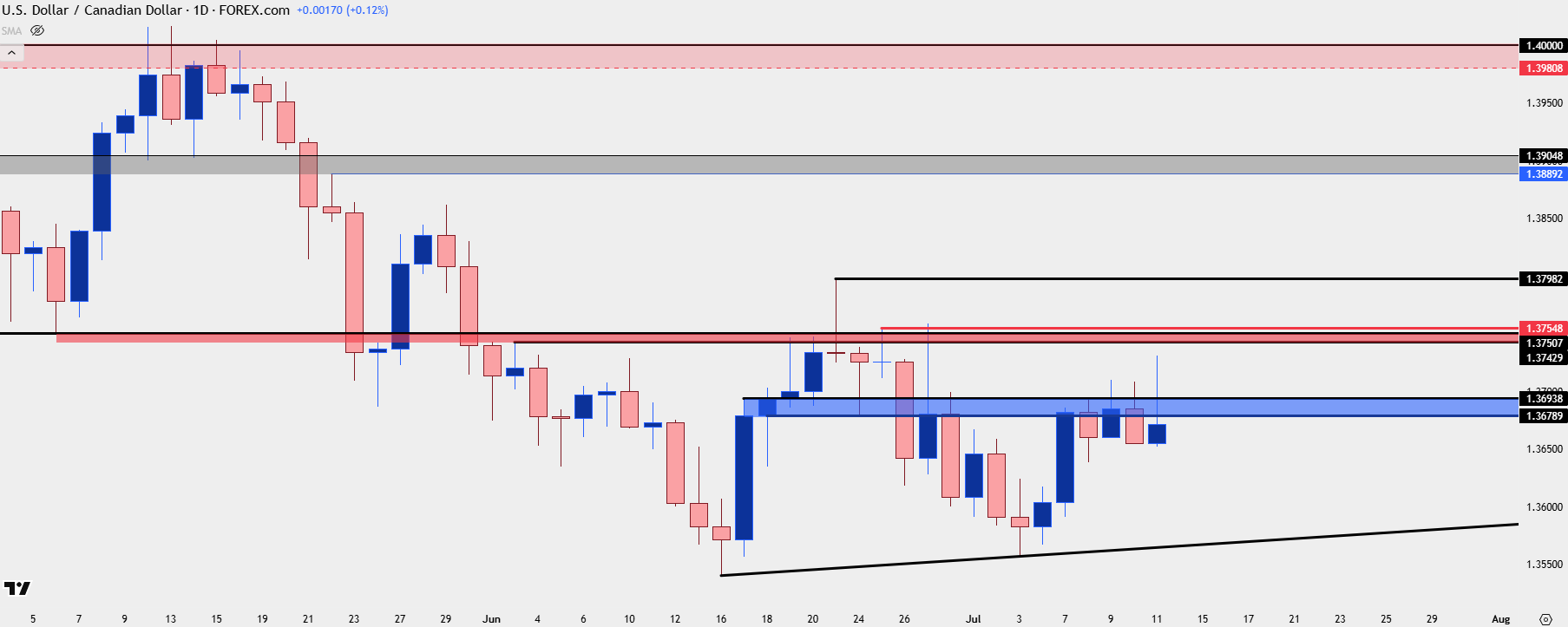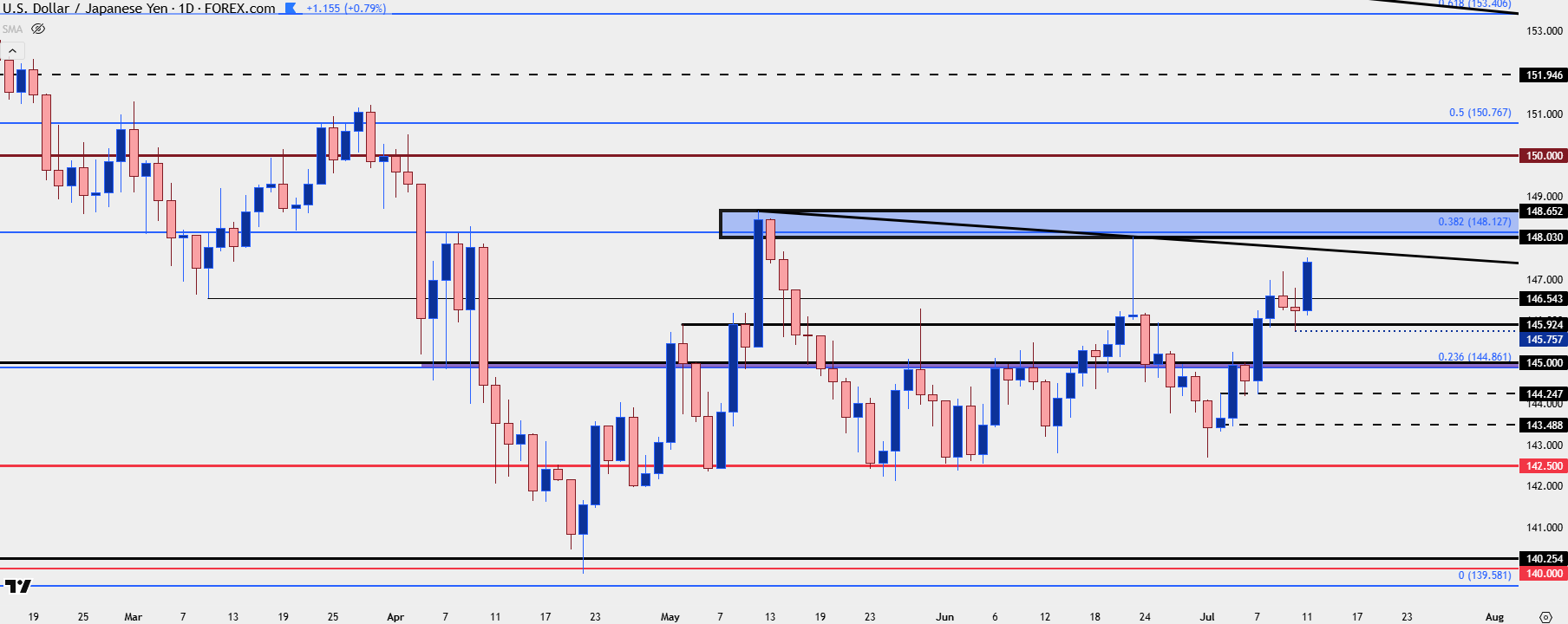 This places even more emphasis on that Tuesday CPI report and if we do see that come out above-expected, logically USD/JPY could rally aggressively on that theme. There may still be a more attractive case for Yen-weakness elsewhere, however, but at this point, buyers have put in a statement move through early-Q3 trade and the door is open for that next test of the 148.00 handle.