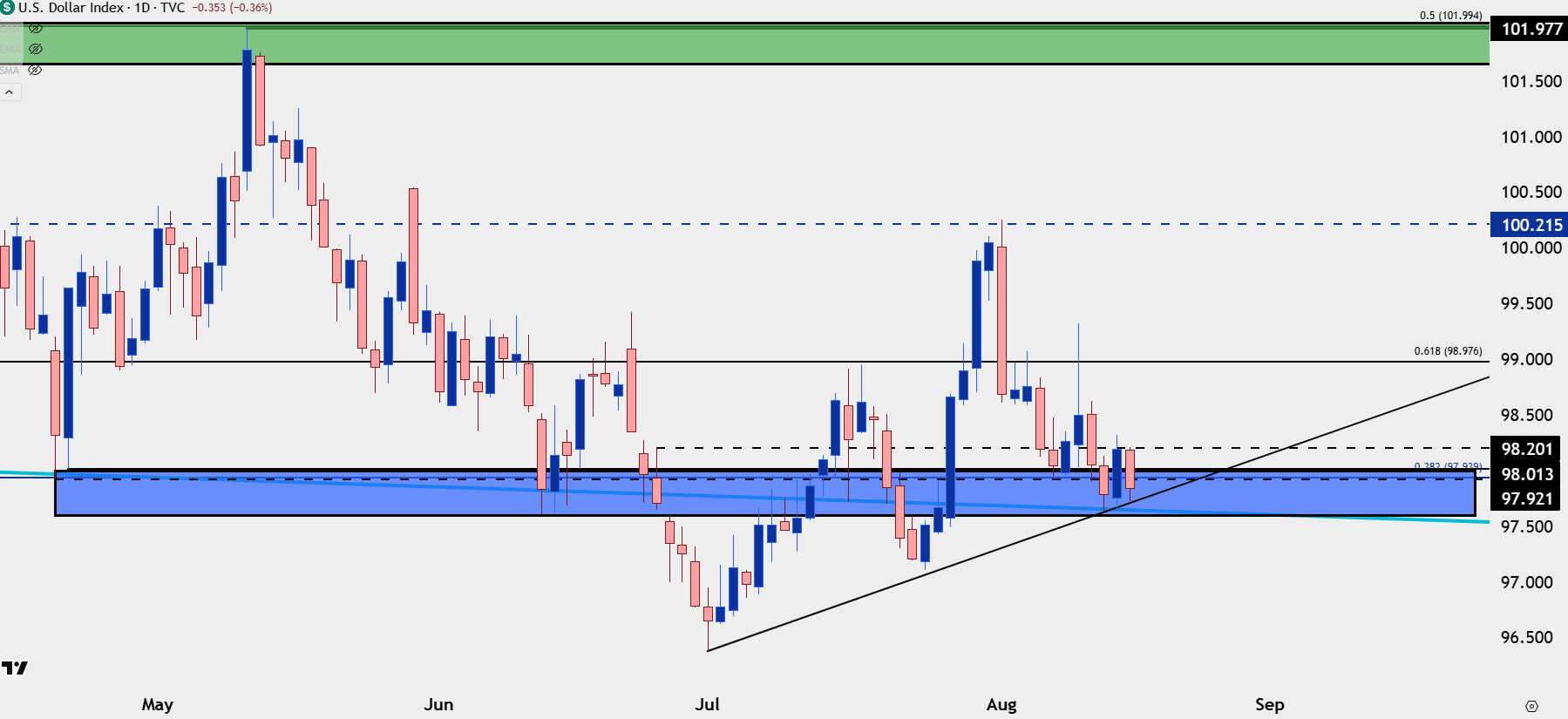 At present, the US Dollar continued to hold higher-lows over the past week that have built so far in Q3. There’s also a long-term trendline in-play as looked at in the Tuesday webinar, and as of right now the USD remains very near the same swing-low that was in-play back in April.