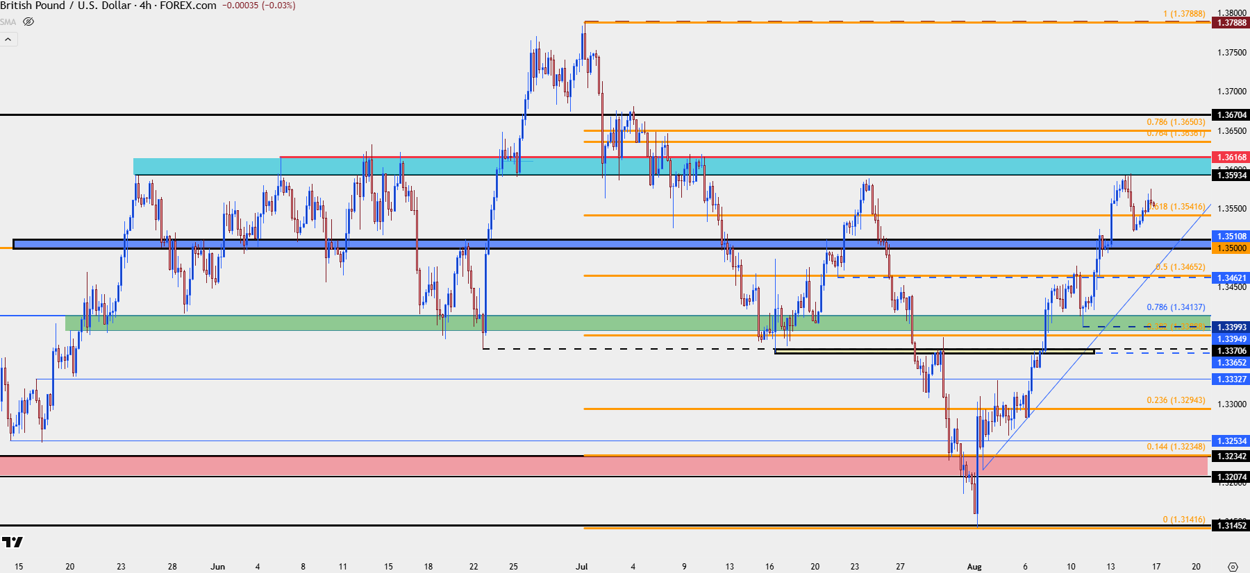 At this point, there’s support structure around the 1.3500 level that GBP/USD grinded through on Tuesday and there hasn’t yet been a check back and re-test of support there. Overhead, it’s the 1.3670-1.3675 zone that stands out as a deeper point of resistance potential.