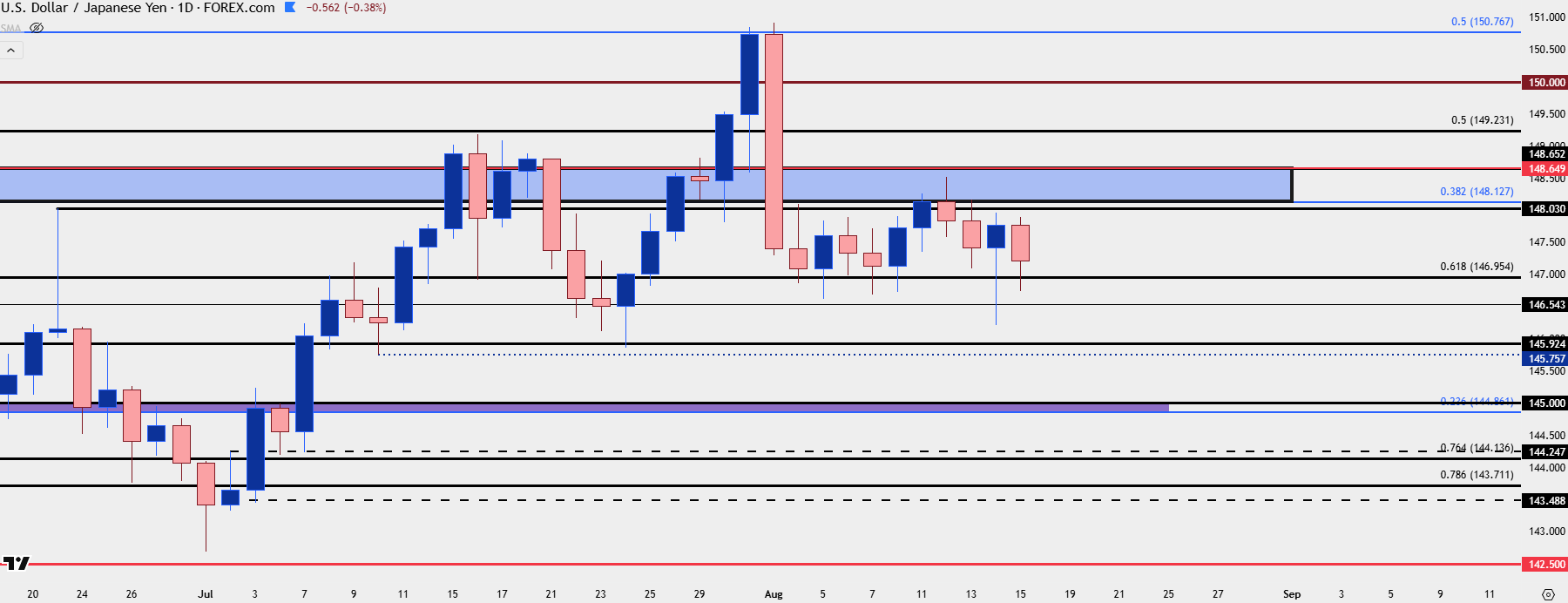 It’s been getting more and more quiet in USD/JPY following the breakout/snapback episode from late-July and early-August. But, notably, sellers had an open door to make a move this week and failed, with the same 146.95 support level coming into hold daily lows on Thursday and Friday.