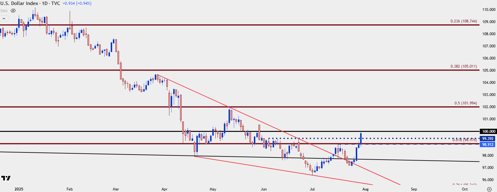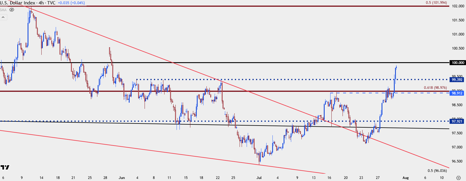 I looked at that backdrop in the Tuesday webinar and as I had highlighted then, this was the price that DXY had hit just before Michelle Bowman’s comment on June 23rd when she said she was ready to cut rates in July. That led to a string of losses in the USD that ran all the way through the end of Q2 with the Dollar setting a fresh three-year-low on day one of Q3. But, since then a different tone has taken over.