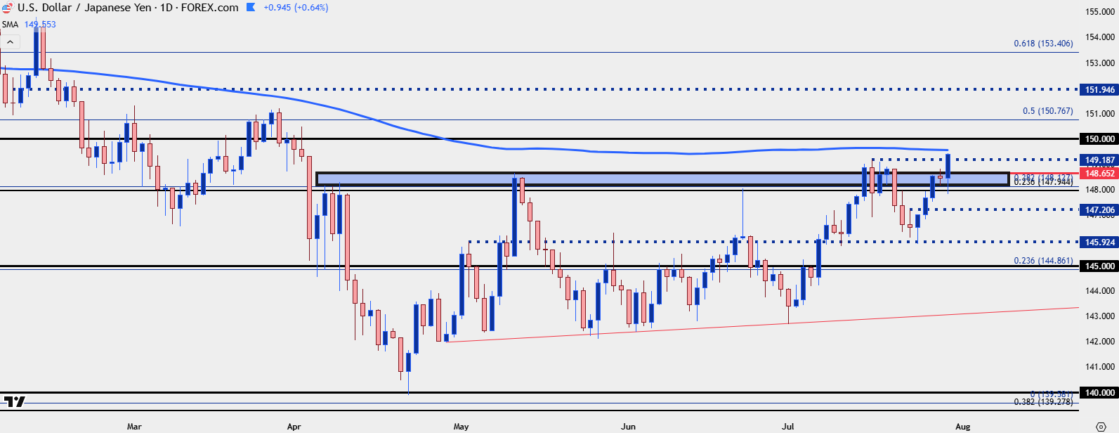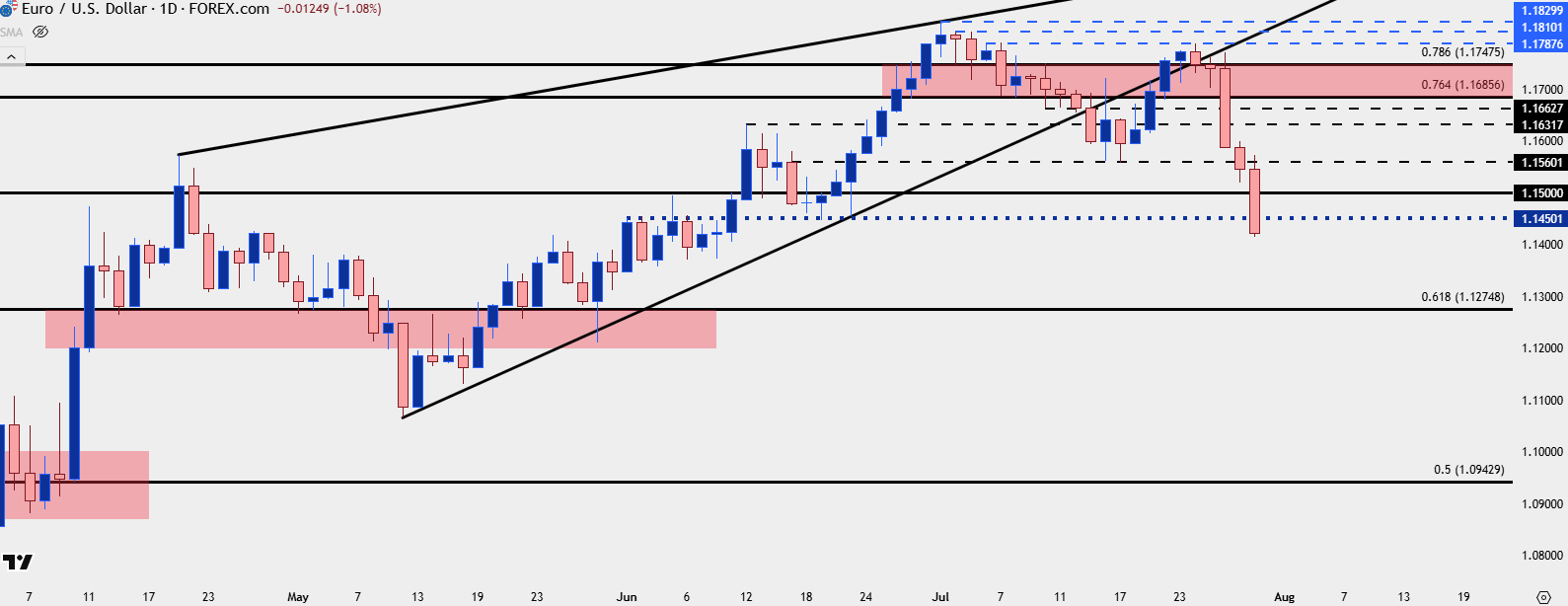 As USD fell in the first half of this year, so did USD/JPY, at least initially. But that 140.00 level was back in-play in April and since then, USD/JPY has been clinging to higher-lows even as USD continued to sell-off. As I’ve been highlighting in videos, I think the macro push behind the USD goes back to USD/JPY on the basis of that carry trade, and this is something that could even impact EUR/USD.